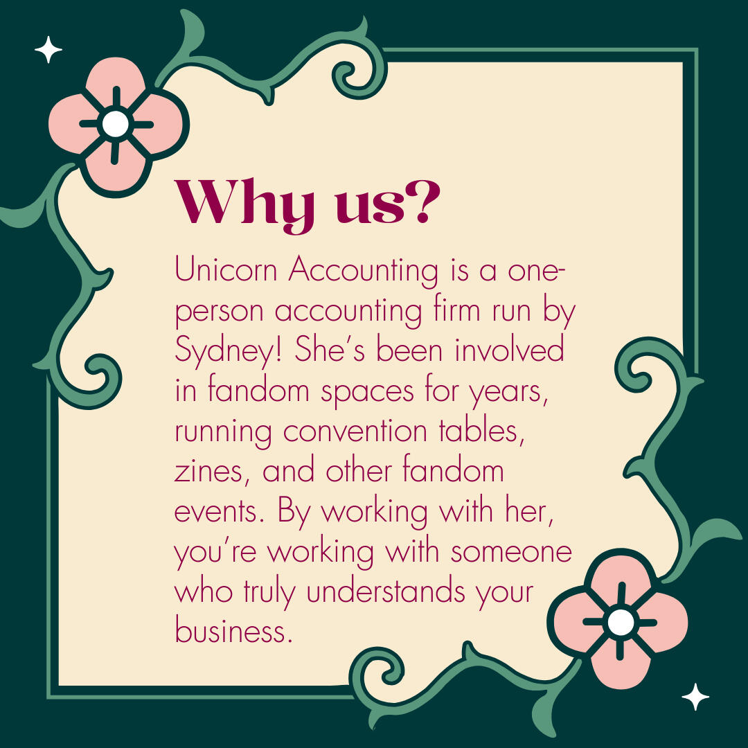 Unicorn Accounting is intended for artists first and foremost. Our mission is to help you feel in control of your finances, and confident in the knowledge that you're doing everything right. You shouldn't have to explain artist alley to your accountant; work with someone who actually understands what you do for a living!